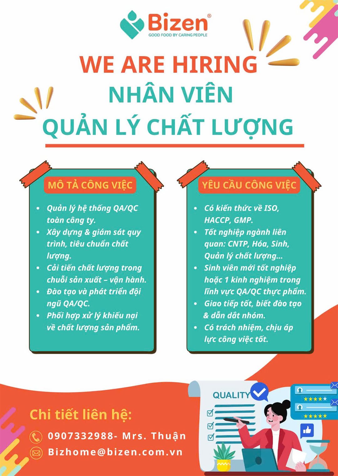 Công ty TNHH Hỗ Trợ Công Nghiệp Bizen, Bizen Catering Services tuyển dụng nhân viên QA, QC ngành Công nghệ thực phẩm