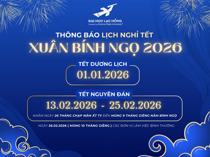Thư viện Trường Đại học Lạc Hồng thông báo đến toàn thể quý bạn đọc Lịch nghỉ Tết Dương lịch và Tết Nguyên đán Bính Ngọ năm 2026 cụ thể như sau: