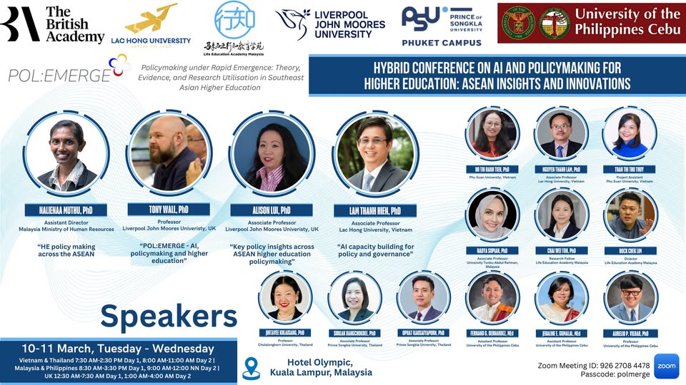 Ngày 10–11/3/2026, hội nghị hybrid “AI and Policymaking for Higher Education: ASEAN Insights and Innovations” diễn ra tại Kuala Lumpur (Malaysia) kết hợp trực tuyến, thu hút 40 đại biểu tham dự trực tiếp và 156 người tham dự trực tuyến từ các trường đại học và tổ chức nghiên cứu thuộc 5 quốc gia của Đông Nam Á.