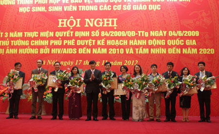 Assoc. Prof. Dr. Tran Quang Quy - Deputy Minister of Education and Training presents certificates of merit to collectives and individuals for their outstanding contributions to HIV/ AIDS prevention movement.
